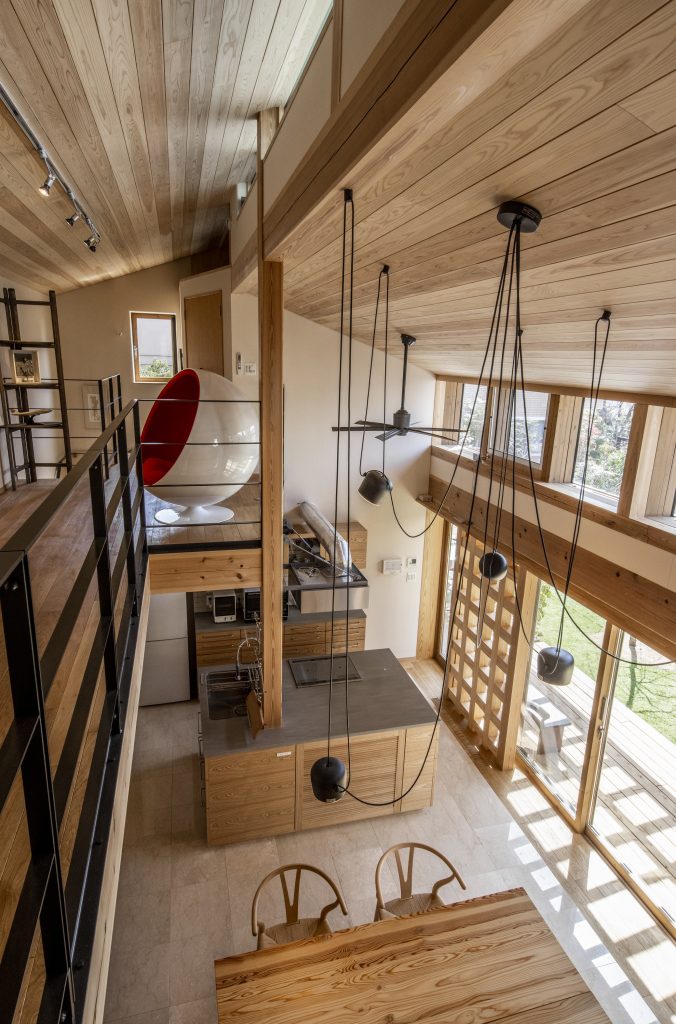 ・冷暖房は室内中央にあるキッチン下部に設置したルームエアコンを使用、夏は1階リビングの石床を冷やし輻射熱により建物全体の温度がゆったりと均一で冷え、冬は1階リビングの石床を温め輻射熱で室内全体がゆったりと均一温度で温まる。