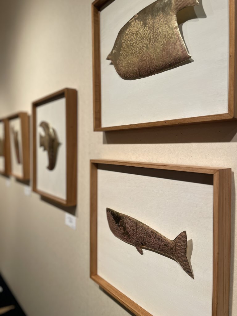 真鍮の塊ひとつひとつに銅版画の技法で凹凸のあるデザインをほどこしたアクセサリーや壁飾りなどを制作。