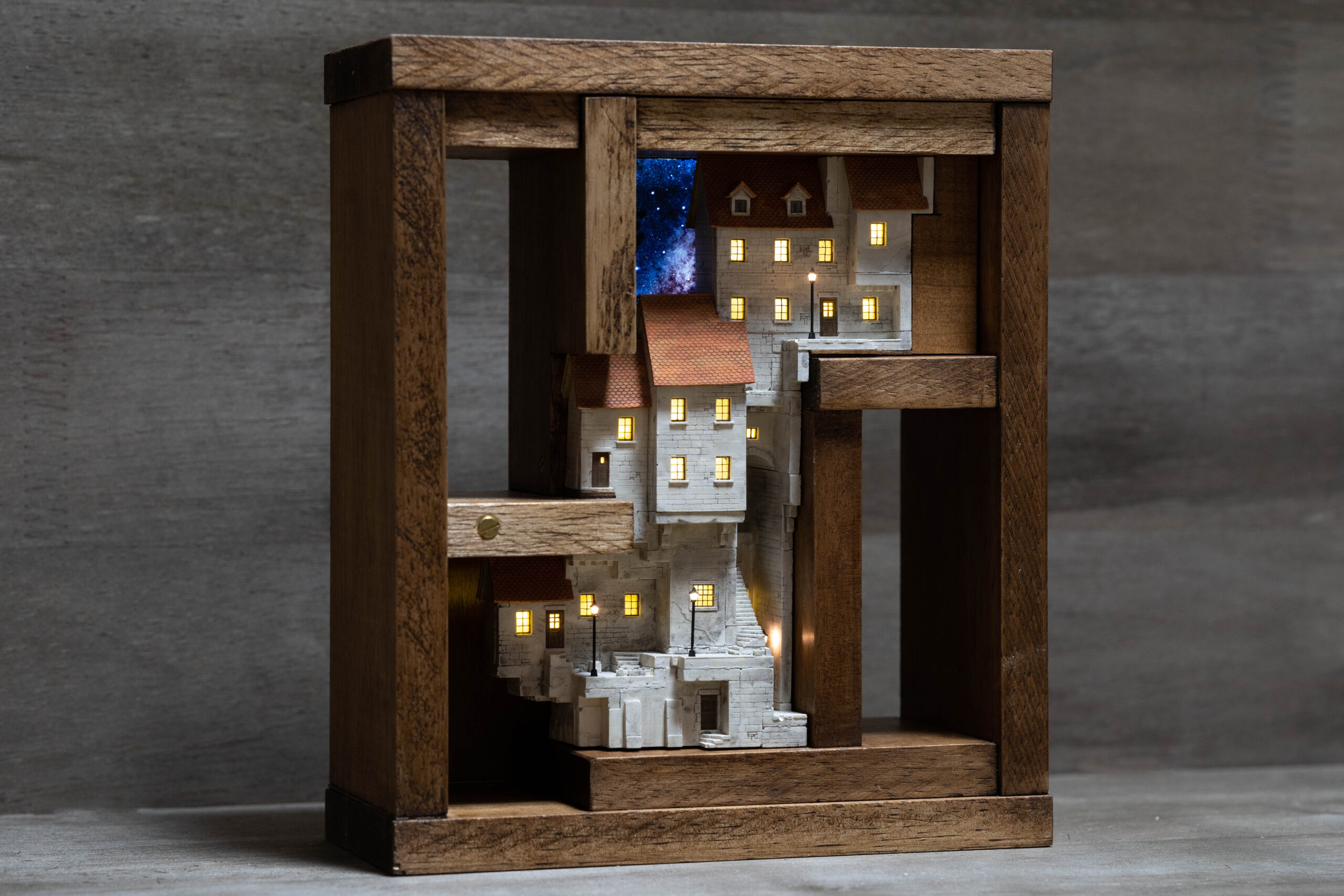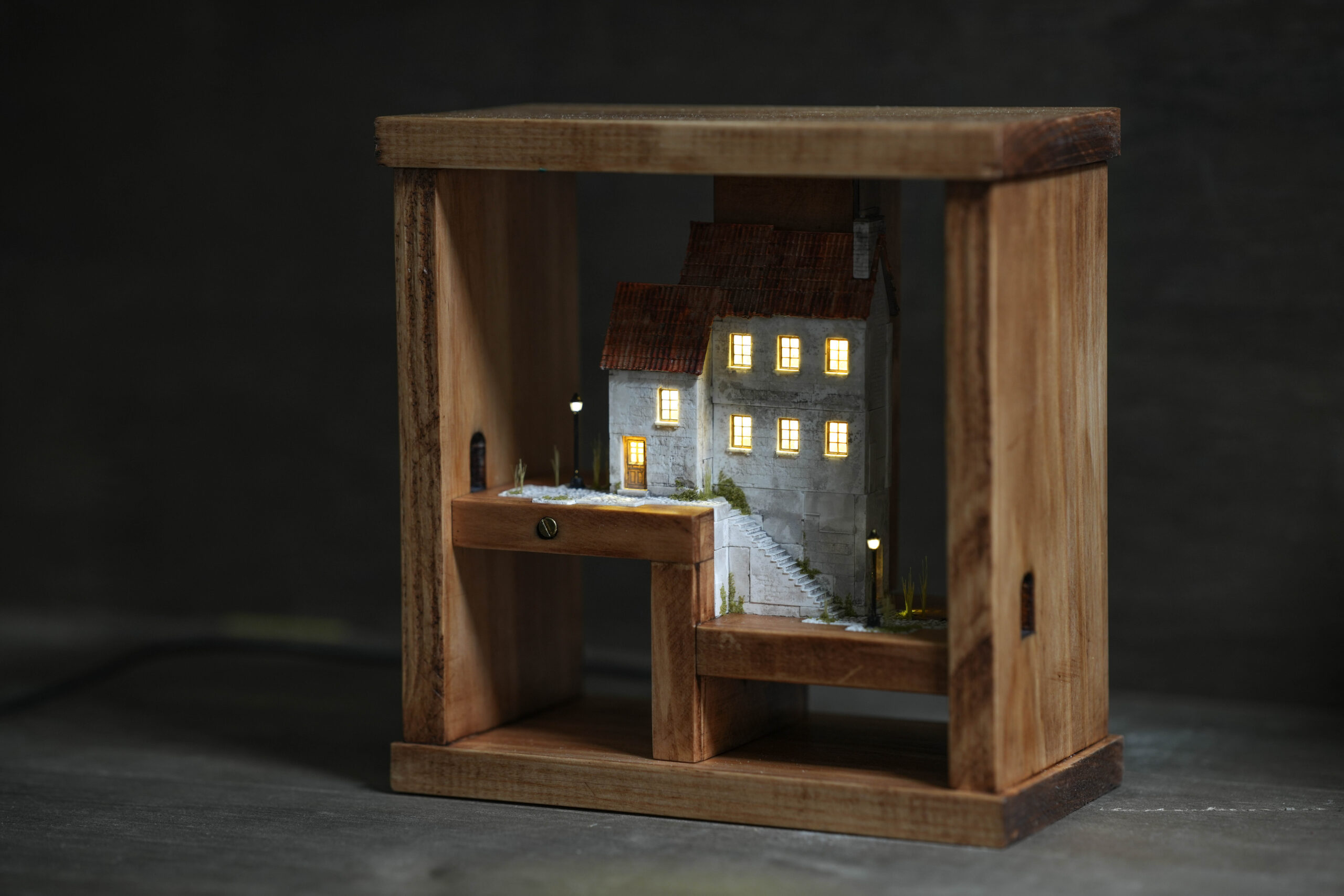 かいだん / はしご 展akariartexhibitionginzaladderlightingartmoonnightmuseumobjectpaintingstepstokyoアートオブジェグループ展たてものはしごミニチュアライティングアート内林武史北見隆夜の美術館展覧会幻想美術暗闇本田小夏東京桑原弘明清田範男灯箱街工房絵画銀座階段